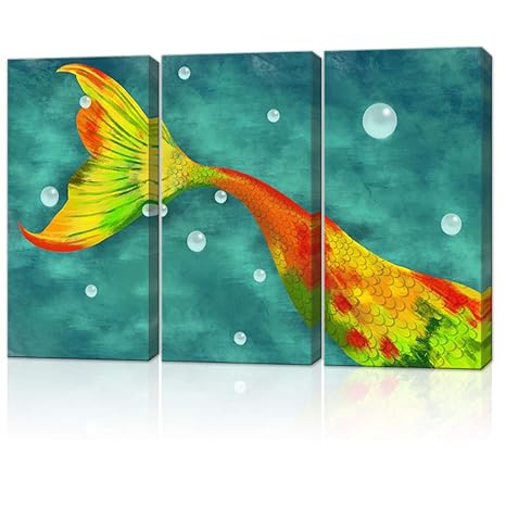 Lovehouse 3 Panel Canvas Wall Art Colorful Mermaid Tail Teal Green