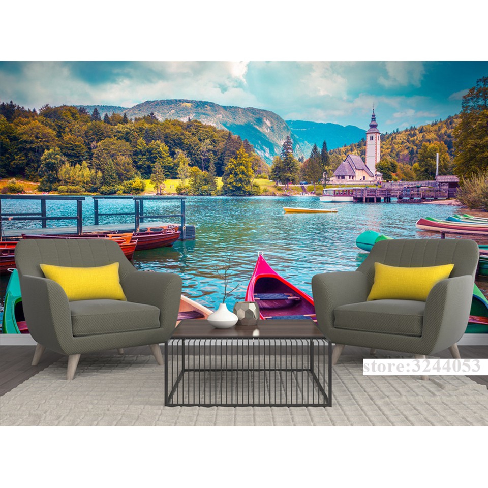 Kustom Alpine Lake Town Landscape Wallpaper Mural 3d Tv Latar